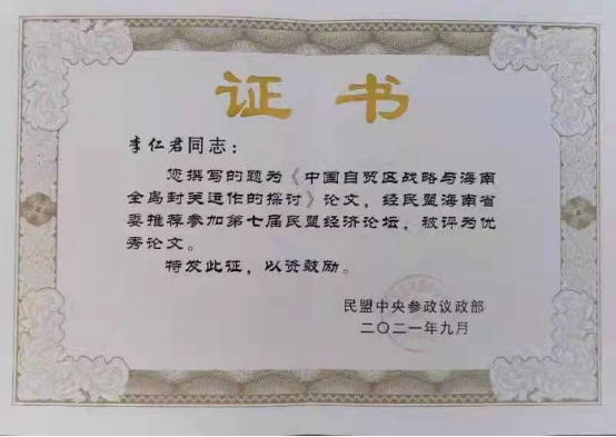 继续教育学院院长、民盟明升体育88委员会主委李仁君教授撰写的《中国自贸区战略与海南全岛封管运作的探讨》一文,经民盟海南省委推荐参加第七届民盟经济论坛,被民盟中央参政议政部评为优秀论文。