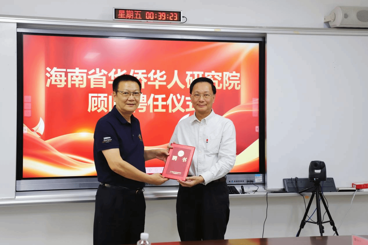 4月13日,海南省华侨华人研究院顾问聘任仪式在田家炳楼102会议室举行,聘任全国归国华侨先进个人、海南中藤科技股份有限公司董事长吴少宏为研究院顾问,明升体育88党委书记符宣国为吴少宏颁发聘书。