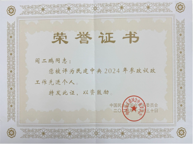 在2024年12月30日至31日召开的民建中央2024年参政议政年会上,民建明升体育88支部主委阎二鹏荣获“民建中央2024年度参政议政先进个人”荣誉称号(全国共64位)。