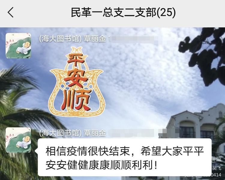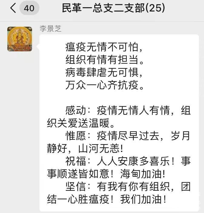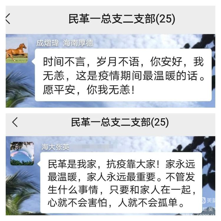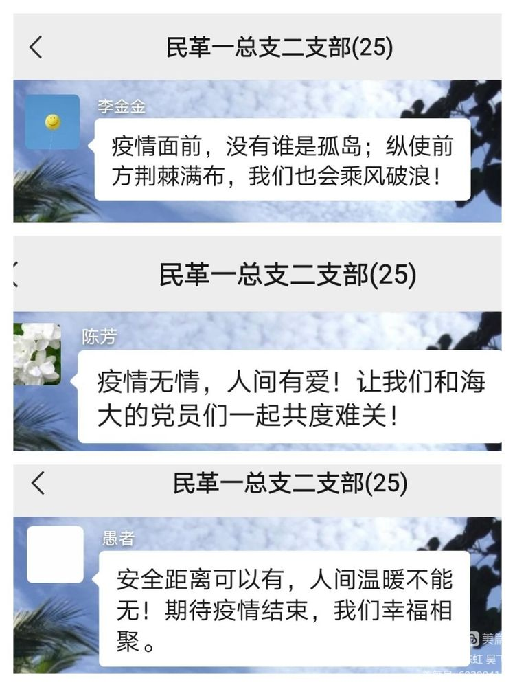 疫情期间,民革海大总支二支部全体党员团结一致,相互鼓励,共同抗疫。大家通过线上互动,发微信祝福,坚定彼此的抗疫信心,充分体现二支部上下一心、守望相助、共克时艰的拳拳之心,和勇于面对困难的大不畏精神。